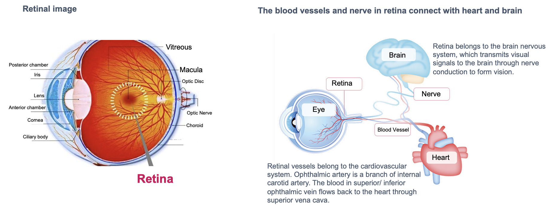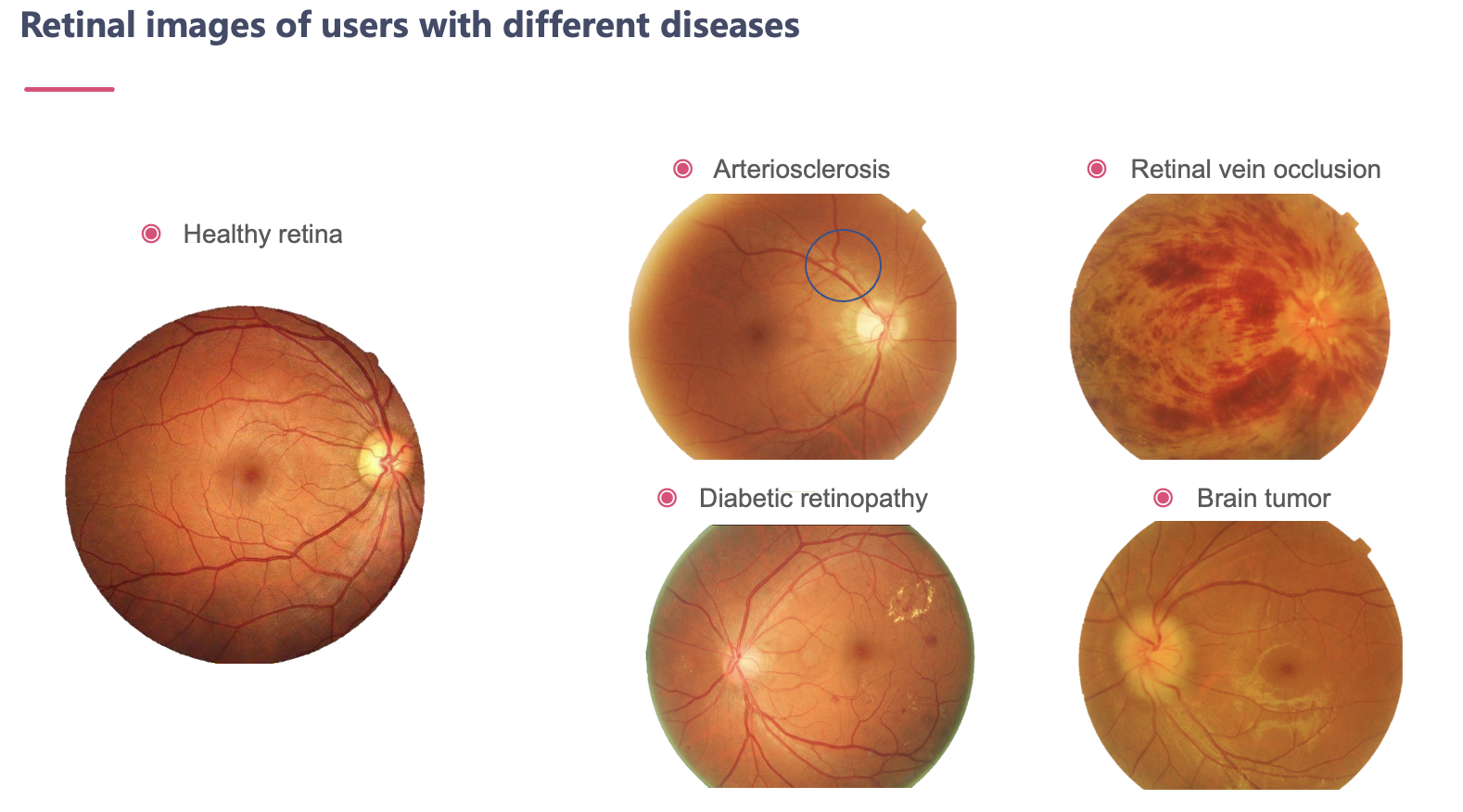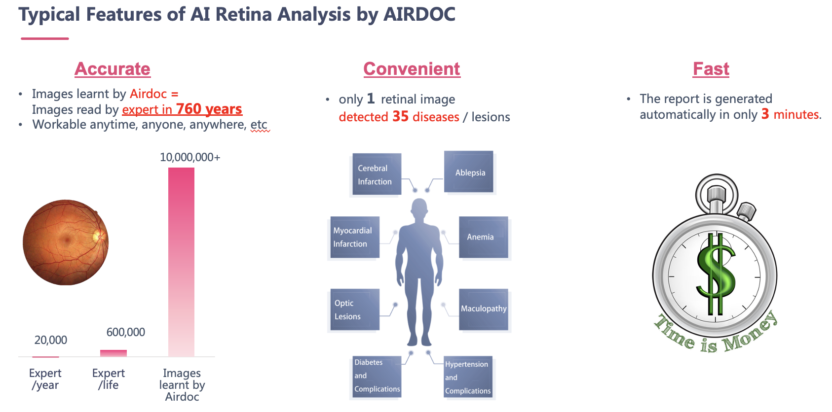 - Make up the shortage: detailed visualized and quantitative sheet to assist diagnosing related eye diseases, solving the shortage problem of ophthalmologists for general practitioner, also value-added services with 6 health risk assessments;